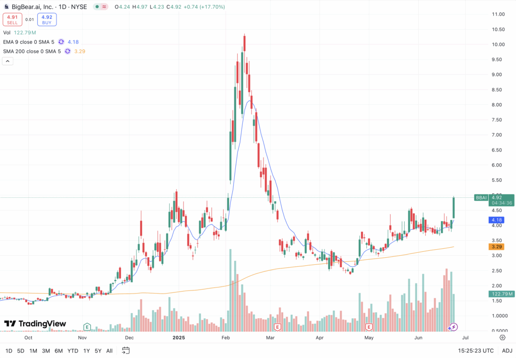 BigBear.ai (BBAI): This stock has recently skyrocketed from around $3.80 to nearly $49 in just a couple of days, fueled by massive volume. It’s definitely one of the hottest stocks right now.